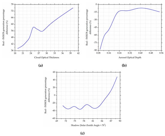 Effect of (a) cloud, (b) aerosol and (c) shadow (SZA > 70°) on the percentage difference between rooftop photovoltaic and INSIOS generations.