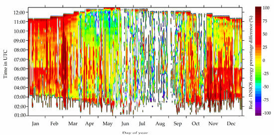 Figure 9 shows the contour plot of the annual variation of the percentage difference between the RPV energy production from the rooftop PV plant and the simulated energy production from INSIOS. For the RPV energy production, during sunrise and sunset, the values are found to vary from 0 to 5 kWh. For RPV energy production, the value increases as the sun rises high in the sky from 5 kWh and reaches the maximum production of around 30 kWh when the sun is directly overhead. The variation of the INSIOS energy simulations with time and day over a year shows similar behavior with greater variation during monsoon season. It is observed that the percentage difference is larger during monsoon and autumn season with overestimations reaching 100%. The percentage difference is moderate during winter and some part of summer with underestimations reaching 100%. The largest differences are near sunset and sunrise mainly because these percentages are at high solar zenith angles. This means that at such low solar elevation, small absolute differences could result in large percentage differences (e.g., 100% difference for 0.1 kWh real PV output and 0.2 kWh simulated output). In [], authors analyzed the performance of a grid-connected rooftop solar PV plant located in coastal regions of Andhra Pradesh. They performed the simulations using PVGIS, PV Watts, and PV Syst and found that the errors in the simulated monthly energy potential as compared to the actual data has reached up to 72%.