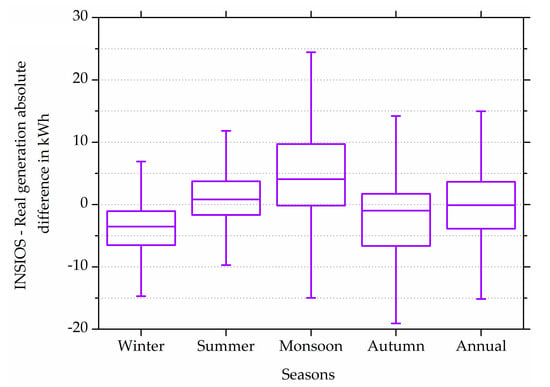 Seasonal and annual box plot of the absolute difference between INSIOS and RPV generation in kWh.