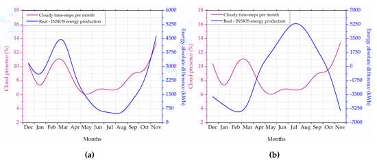 Figure 12 shows the variation of the difference between the simulated and the RPV energy production with monthly cloud time-steps. It is seen that the presence of clouds is fluctuating between 6% and 11% from December to April during which the absolute energy difference between RPV and simulated energy productions follow the same trend of fluctuation between 2250 to 4500 kWh when only CD time-steps are considered as observed from Figure 12a. During this period, there is overestimation from INSIOS simulations and the absolute energy difference between simulated and RPV energy productions first increase from around 3500 to 5500 kWh from December to March and then decreases to 0 kWh during April when all time-steps are taken into account as can be seen from Figure 12b. From May onwards, the cloud presence slowly increases from 6% to 13% with a steep increase during October and November. During this period, the energy difference for CD time-steps first decreases from 1500 kWh in May to a minimum of 370 kWh in August and then increases monotonically to 4900 kWh in November. The energy difference in all time-steps observes underestimations from INSIOS simulations from April to July with values increasing from 0 to 5250 kWh which starts decreasing beyond this to 0 kWh in October and then the nature of the estimations changes to overprediction which increases up to 5400 kWh in November. The overestimation is related to the monsoon period and the subsequent phenomena which are also shown in Figure 8 and Figure 10. From Figure 12a, it is observed that the error in the INSIOS energy estimation as compared to the real PV generation is following the presence of clouds. As the presence of clouds intensifies, the capability to monitor cloud properties through remote sensing technologies decreases which in turn decreases the accuracy of the model and hence increases the error in PV energy production estimation as compared to the real PV generation.