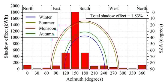 Figure 13 shows the annual variation of the absolute energy losses of the roof-top PV in terms of azimuthal shadows from the surrounding environment. The shadow effect on PV energy production was simulated by using an anisotropic sky model [] in conjunction with the shadow mapping and the calculation of the sky view factor as described in []. The necessary digital terrain and surface modeling data were retrieved by Google Earth. For the NITK roof-top PV, the shading is caused mainly by a nearby building and trees which are present in the south direction of the panels (i.e., 120–180 azimuth degrees). From the calculations performed, an analytical diagram of the position of the sun (elevation and azimuth) was created. The superimposition of this information by the shape of the azimuthal shading profile, determines when the path of the sun to the panels is blocked, and hence, provides the shadow effect. From the aforementioned simulations we found that the shadow effect applies to SZA greater than 70°. We also note that both AOD and COT effects were considered equal to zero for these simulations to represent only the shadow effect. It is observed that the absolute azimuthal shadow effect remains within 200 kWh for azimuth varying from 0 to 90° and 210 to 360°. It is around 500 kWh for 120° and 180° azimuth angles and is maximum at 150° reaching almost 1800 kWh. The total effect of shadows is found to be 1.83% of the total energy production. At south, southeast direction there is the highest blocking because of a building, at a particular time at NITK,  and  are fixed and hence the SZA and the solar azimuth angles were calculated as shown in Equations (4) and (11), respectively. The lines of constant declination labeled as winter, summer, monsoon, and autumn are shown in Figure 13. The curves for different seasons are calculated using the median day of each season and they represent the declination angle of that particular day. These curves are constant for a particular latitude and day. Similar curve was shown in [] for a latitude of 15°.