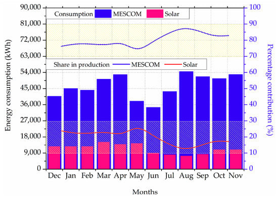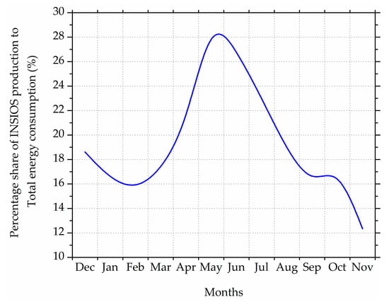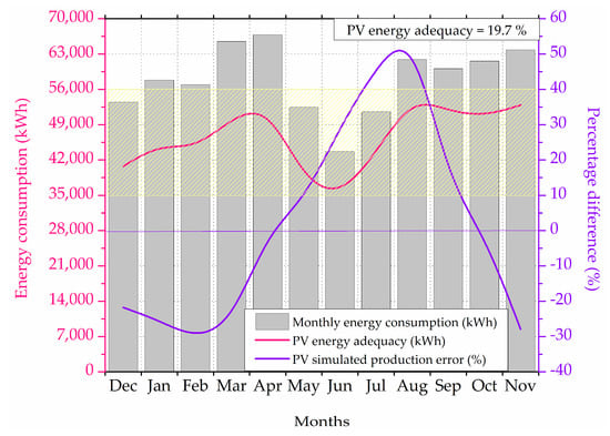 Figure 14 shows the monthly energy adequacy for RPV data and simulated data in which adequacy is calculated as shown in Section 2.2.3. The monthly energy consumption varies from 430,000 to 640,000 kWh over a year. Renewable energy adequacy is calculated as the difference between the total energy produced and the energy produced from solar which is found to vary from 35,000 to 50,000 kWh over a year with a dip during monsoon months. The percentage error from PV simulated production as compared to the RPV measurements varies from −30% to 50% over a year. It can be seen from Figure 14 that there are underestimations from INSIOS simulations from December to April and in October and November while there are overestimations between May and September. The monthly energy consumption increases from 52,000 kWh in December to 67,000 kWh in April and then decreases to a minimum of 44,000 kWh in June with a further increase to 64,000 kWh in November. The renewable energy adequacy increases from 41,000 kWh in December to 53,000 kWh in April and decreases from 38,000 kWh in May to a minimum of 35,000 kWh in June with a further increase to 53,000 kWh in November. The PV energy adequacy is found to be 19.7% which is calculated as the average of the monthly PV energy adequacy. The underestimation percentage difference in energy production increases from 22% in December to 26% in March becoming zero in April while it is 1% in October and 28% in November. The overestimation percentage difference increases from 8% in May to a peak of 57% in August becoming zero during October.