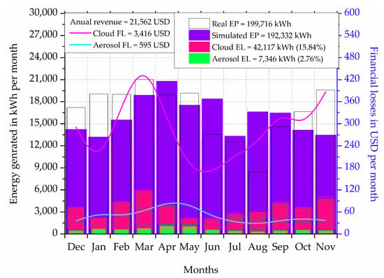 where FL is the financial loss in USD,  is the maximum energy produced in kWh considering the atmosphere to be clean and clear i.e., with AOD and COT being zero and  is the actual energy produced by considering AOD for CS condition and COT for the CD condition. The price of electricity is in USD per kWh. Adequacy is calculated in terms of the total energy consumption as the difference between the total energy produced/consumed and the energy produced from renewable (or solar in this analysis). Adequacy percentage is the ratio of the energy consumed from renewable to the total energy consumed/produced.