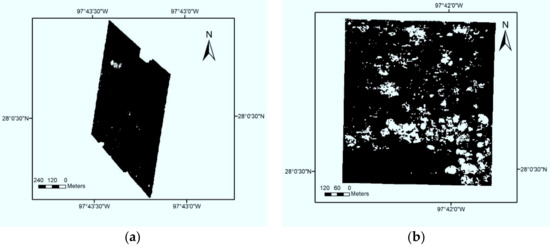 The regrouped cotton root rot classification maps identified by the airborne imagery for the two cotton fields are shown in Figure 3. The white color inside each field depicts the root rot-infested zones, while the black color represents the non-infested zones. Care was taken to guarantee that the infested regions were accurately distinguished by visual comparison with RGB images. The field surveys revealed that cotton root rot was the predominant stressor and that there was no obvious interference from other factors in these fields, under which situation the classification accuracy utilizing the ISODATA and regrouping methodology can be guaranteed [30]. The percentage of root rot-infested zones ranges from 0.80% for Field A to 13.25% for Field B, representing slightly diseased and severely diseased fields in the area.