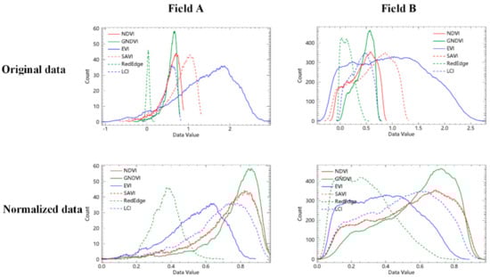 The histograms of the VIs for the two fields, before and after normalization, are shown in Figure 4. Obviously, the values of the six VIs differed greatly before normalization, which was consistent with the descriptive statistics given in Table 3. As for the two fields, the curve shapes of the histograms were close to each other, indicating that the value distribution patterns of the VIs were consistent between the two fields. After normalization, different VIs shared the same value range, which made it easy to perform a comparative analysis of the VIs. The EVI had the most equalized distribution. The green normalized difference vegetation index (GNDVI) had the most concentrated distribution in the high-value section, while Red Edge 2 (RedEdge) occupied more space in the lower value range. The histograms of the NDVI and the soil adjusted vegetation index (SAVI) almost overlapped with each other after normalization. Between the two fields, the curve shapes of the normalized VI histograms had no obvious differences, forming a clear contrast with those before normalization. This comparative analysis revealed that the normalization process could eliminate the influence of field conditions on VIs, which should be a very useful feature in large scale crop monitoring.