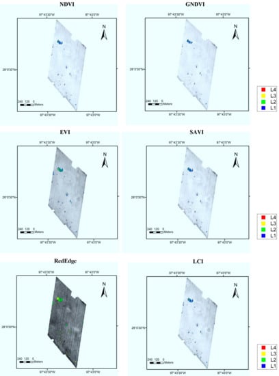 Crop classification based on remote sensing has been able to achieve very high accuracy, but symptom discrimination of different stresses from airborne or satellite imagery is still a great challenge and remains to be further studied. Various stress factors, for example, drought, pests and nutrient insufficiencies, also cause a decrease in chlorophyll content, which in turn causes a blue shift in the red edge and other spectral feature parameters [41,42,43]. Since the remote sensing signal is not unique to a specific factor [16], for the early recognition of crop disease using remote sensing, field scouts can help to confirm the cause for the spectral signal at that location. Alternatively, if the fields are known to be infested with a specific disease, such as cotton root rot in this study, then a map of severity levels can be created. In future research, this grading method will be evaluated for the analysis of other crops, diseases and insect pests. Thus, using the database of various reference datasets corresponding to different crops as well as stress factors makes it conceivable to precisely identify the crop species and stress severity in the crops.