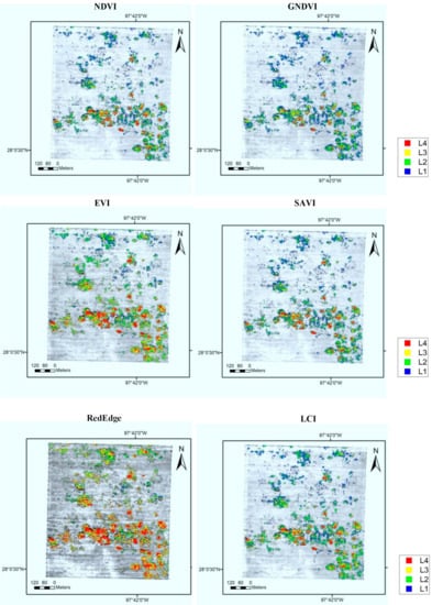 It is noteworthy that L0 pixels tend to have high VI values, not only because they are in the latent period when the disease symptoms are not very obvious, but also because of the errors due to root rot classification accuracy. Therefore, in the following disease severity estimation sections, only Levels 1–4 will be primarily considered. By displaying the disease severity levels on the VI maps, the distribution and development of the crop disease can be clearly observed.