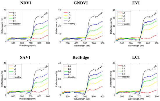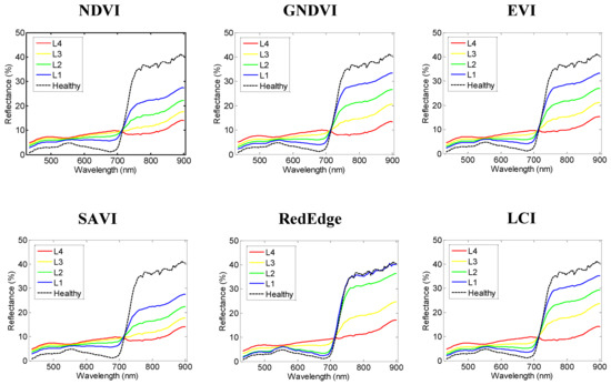 The mean spectra of the infested area at different severity levels and the spectra of healthy cotton with the highest NDVI value in Field A and Field B are shown in Figure 8 and Figure 9, respectively. It can be seen that the average spectra of each disease level are almost identical in the two fields, indicating that the disease severity grading results in different fields are highly comparable. Therefore, the newly proposed crop disease severity grading method is applicable to fields with different disease severity levels and field growing conditions, which is a very important feature for large area applications. The spectral comparison of infected and healthy plants indicated that the reflectance in the NIR range (700–900 nm) was essentially lower from infected plants than that from healthy ones. Conversely, significantly less light was absorbed in the visible region (400–700 nm), or reflectance in the visible region was significantly high from infected plants (Figure 8 and Figure 9). Nevertheless, the changes in the green bands between healthy and infected plants were not noteworthy in the two fields. These spectral variation patterns are in accordance with the ground survey results of previous research [15,33], further verifying the effectiveness of the disease grading method from another perspective.