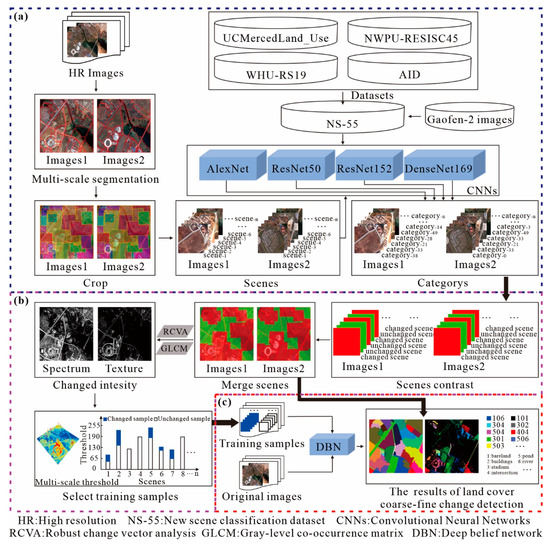 The schema of the proposed approach. (a) The first part. We used our self-built scene classification dataset NS-55 to train four CNNs, and used these four CNNs to detect the categories of all scenes that were cropped in the experimental area. (b) The second part. By comparing the scene categories, the changing scenes were obtained, and the RCVA and GLCM algorithms were used to calculate the change intensity value of the image. According to the changed scene, the MST was used to divide the changed sample and the unchanged sample. (c) The third part. We used high-quality training samples obtained by MST to train DBN, and use the trained DBN to detect the pixel-level range changes. The category detection results were mapped to the range change detection results to obtain the fine change detection results.
