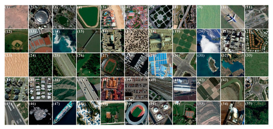 In addition to the impact of preprocessing results and CNNs on the detection results of deep learning change detection based on scene classification, the datasets used for training often determine the richness of its detection categories, which in turn affects the accuracy of the detection results. In order to obtain a dataset containing more scene categories than the general dataset, we produced an NS-55 scene classification dataset. The data in NS-55 came from NWPU-RESISC45 [43], UCMercedLand_Use [44], WHU-RS19 [45], and AID [46], and added a large number of scene images cropped from Gaofen-2 satellite remote sensing images.