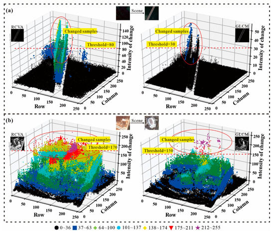 In different scenarios (changed), different thresholds can be calculated using Equation (4). The threshold is used to divide the intensity value of the spectral and textural changes to separate the changed and unchanged samples, so as to obtain two sets of training samples corresponding to RCVA and GLCM. Finally, the combination of two sets of samples is taken as the final training sample.