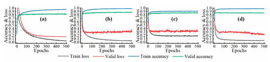 Accuracy and loss value of the training CNNs. (a) AlexNet. (b) ResNet50. (c) ResNet152. (d) DenseNet169.