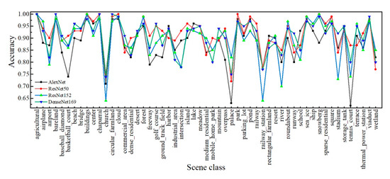 There is a specific adaptive relationship between the complexity of remote sensing images and the depth of CNN. That is, when using shallow and deep CNN to classify images with low complexity and high complexity, respectively, if the correspondence between CNN and image complexity is effectively used, the inherent characteristics of CNN can be fully utilized to improve classification accuracy [49]. According to Zhang Xiaonan et al. [45] and Li, H [49], AlexNet has a high recognition rate for macroscopic scenes such as snow mountain, beach, cloud, runway, forest, and bridges; ResNet50 has a high recognition rate for scenes with fixed shapes such as basketball courts, baseball fields, golf courses, ground track field, and airplanes; DenseNet169 has a higher recognition rate for abstract scenes with more semantic features such as the park, harbor, chaparral, sea ice, and island; and ResNet152 has a high recognition rate for scenes such as lakes, terraces, thermal power station, and mobile home park. AlexNet and ResNet are the champions of the classification task of the ImageNet competition in 2012 and 2015, respectively, and DenseNet is a CNN model with a better performance developed on the basis of ResNet. This paper selected the above four CNNs as the basic network for scene classification: