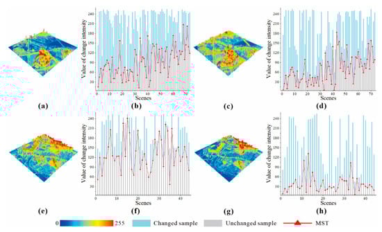 Schematic diagram of MST dividing training samples. (a) The change intensity value of the spectrum (Site1). (b) MST divides the samples according to the value of the intensity of the change in the spectrum (Site1). (c) The change intensity value of the texture (Site1). (d) MST divides the samples according to the value of the intensity of the change in the texture (Site1). (e) The change intensity value of the spectrum (Site2). (f) MST divides the samples according to the value of the intensity of the change in the spectrum (Site2). (g) The change intensity value of the texture (Site2). (h) MST divides the samples according to the value of the intensity of the change in the texture (Site2).