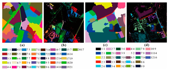 Color images of the Hanyang area in the city of Wuhan. The red box is the first test area (Site1), and the yellow box is the second test area (Site2). (a) The image was taken on 11 February 2002. (b) The image was taken on 24 June 2009. (c) 2002 scene category label. (d) 2009 scene category label.