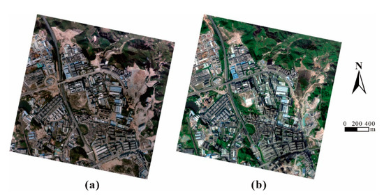We obtained an image of an area in Dapeng New District, Shenzhen, by aerial photography. The image size was 5622 5587 pixels, the acquisition time was December 2014 and May 2017, and the resolution was 0.5 m including three bands of red, green, and blue, as shown in Figure 12.