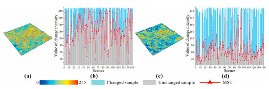 Schematic diagram of MST dividing training samples (Experiment 2). (a) The change intensity value of the spectrum. (b) MST divides the samples according to the value of the intensity of the change in the spectrum. (c) The change intensity value of the texture. (d) MST divides the samples according to the value of the intensity of the change in the texture.