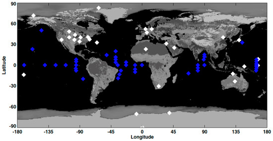 Geolocations of 43 buoys (blue diamond) and 30 land-surface sites (white diamond) where downward irradiances used in validation were taken (after Rutan et al. [5]).