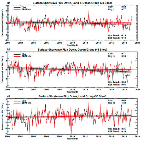 (a) Deseasonalized monthly surface downward shortwave anomalies computed with observed irradiances shown at 43 buoys and 30 land sites. Black and red lines are observed and energy balanced and filled (EBAF)-computed irradiance anomalies. Linear regression lines are also shown with the same color. A 95% confidence interval of the observed trend is shown by shade. “Corr” and “Reg(ional)” indicate correlation coefficient and standard deviation. The slope of the linear regression line shown on bottom right is Wm−2 decade−1. (b,c) plots show anomaly time series for, respectively, 43 buoys and 30 land sites separately.