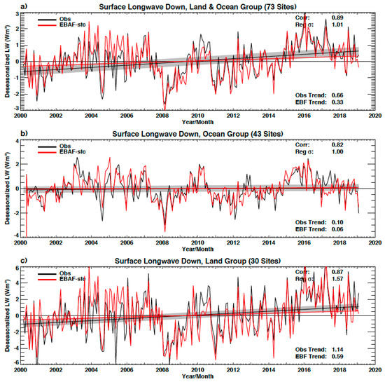 While this method produces time series by minimizing the impact of variable number of sites, the trend derived from the combined time series by linear regression is not the same as the mean slopes derived from individual sites. If all sites have the same observation length, cover the entire time series, and all sites have the same trend, then the trend derived from combined time series is the square root of the number of sites times the trend. Other than this ideal case, the trend of combined monthly anomalies depends on record lengths and time of observation periods of individual sites, in addition to trends at individual sites. For land time series, 17 and 18 out of 30 sites cover at least 80% of the 19-year shortwave and longwave time period (228 months), respectively. Therefore, the trend of the combined time series is primarily driven by trends that exist in observations (real or not), not by variable number of sites with time. Observation lengths over oceans are shorter. However, as shown later in this Section, differences in the time series derived from observations and EBAF over oceans are similar to those derived over land, suggesting that the trend of combined time series over oceans is also driven by trends in observations.