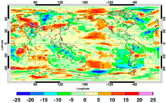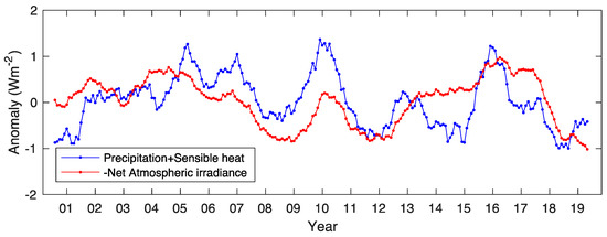 Figure 7 shows the time series of global (90°N to 90°S) monthly anomalies of diabatic heating due to precipitation and sensible heat flux by the blue line. In addition, the red line is global monthly anomalies of net atmospheric irradiance multiplied by −1. Diabatic heating anomalies are derived from Edition 2.3 Global Precipitation Climatology Project (GPCP, [26]), surface sensible heat flux anomalies are derived from ERA5 [27], and net atmospheric irradiance anomalies are derived from Edition 4.1 EBAF data products. Standard deviations of deseasonalized anomalies with a 12-month moving window of diabatic heating due to precipitation, sensible heat flux, and net atmospheric irradiance are, respectively, 0.58 Wm−2, 0.16 Wm−2, and 0.51 Wm−2. The net annual energy input to the atmosphere is very close to 0 when fluxes are averaged over the entire globe. The balance is achieved by diabatic heating by precipitation, sensible heat flux at the surface, and radiative cooling. However, when satellite derived data products are used, the residual of the atmospheric energy balance averaged over 10 years (from July 2005 through June 2015) is −14 Wm−2, where the means of net atmospheric irradiance, diabatic heating by precipitation, and sensible heat flux are, respectively, −109 Wm−2, 78 Wm−2, and 17 Wm−2. Even though the global annual mean atmospheric energy budget derived from these products has the residual, the anomaly time series derived from GPCP+ERA5 and EBAF data products are reasonably consistent with a correlation coefficient of 0.46. Given that precipitation and radiation are derived independently from different instruments, this agreement is encouraging. As longer time series become available and more energy flux components are observed by many different instruments, the energy balance can be a useful tool to assess the quality of data products or derive missing flux components.