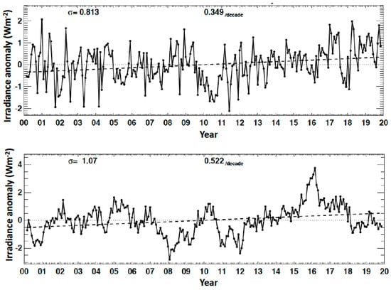 Global monthly deseasonalized anomaly time series of surface downward (top) shortwave and (bottom) longwave irradiances. Two numbers shown at the top of each plot are the standard deviation of anomalies (σ) and slope regression line (dashed line).
