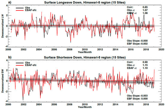 Deseasonalized anomaly time series of surface downward (a) longwave and (b) shortwave irradiances from buoys and a land site within the region covered by Himawari-8. Included surface sites are, in the Pacific Ocean 8-TAO buoys, in the Indian Ocean 5-RAMA buoys, in the N Pacific the Kuroshio Current Buoy (KEO) and a ground site at Alice Springs, AU. Anomalies at individual sites are normalized by the standard deviation (see text for the detail). Black and red lines are observed and EBAF irradiance anomalies. Linear regression lines are also shown with the same color. A 95% confidence interval of the observed trend is shown by shade. Himawari-8 replaced MTSAT2 on 6 July 2015.