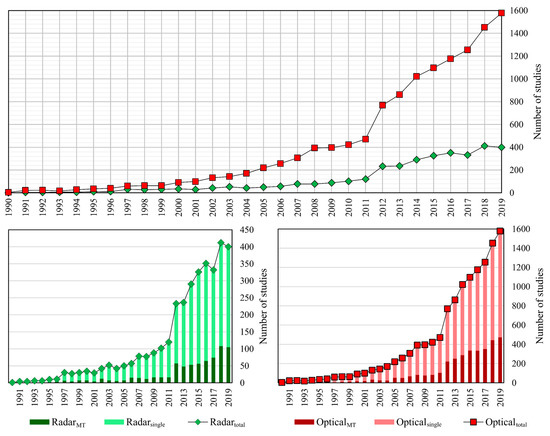 The number of published articles (1990–2019) listed in the Web of Science Core Collection containing the terms/topic “radar” or “scatteromet*” or “microwave*” or “SAR” for radar, and “optic*” or “Landsat” or “Sentinel-2” or “Sentinel-3” or “Quickbird” or “MODIS” or “IKONOS” or “GeoEye” or “WorldView” for optical imagery, refined by “land cover” or “land use”. To extract a number of multitemporal related articles, the final results were refined by “multitemporal” or “multi-temporal” or “multi temporal” or “time-series” or “time series”.