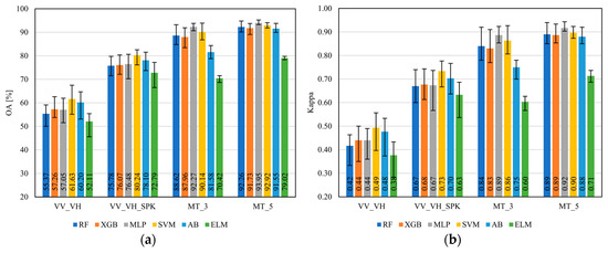 Figure 3 evaluates the performance of the tested machine learning methods. The SVM classifier performed better using the single-date S1 imagery, while the MLP performed better on the MT imagery when the number of input features was higher. If we compare boosting classifiers, AB performed better than XGB in the single-date classification scenario; conversely, XGB achieved better results in the MT scenario. The ELM classifier achieved the lowest classification results in this research. By introducing temporal information (i.e., five S1 imagery), the overall accuracy of all classifiers exceeded 90%, except for the ELM.