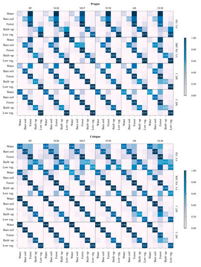 In this research, the SVM and MLP classifier achieved the highest OA and K (Figure 3) for urban vegetation mapping in the single-date (i.e., VV_VH, VV_VH_SPK), and in the MT (i.e., MT_3, MT_5) classification scenario, respectively. Therefore, McNemar’s χ2 test was statistically used to compare the classification results achieved by SVM and MLP against other classifiers for each study area (Table 5). SVM is less often wrong than any other classifier in the single-date image analysis. However, it should be noted that in some classification scenarios, SVM and AB perform very similarly. This is shown in Table 5, as the χ2 value indicates that two classifiers perform equally well with a probability of at least 95%. Using the MT SAR imagery, in Prague and Cologne, MLP achieved statistically different results from those produced by other classifiers. In Lyon, MLP yielded comparable classifications results to other classification methods, except for the ELM classifier.
