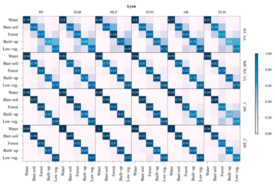 Since it is possible to obtain higher classification accuracy using an imbalanced data sets [81], macro-averaged measures (i.e., F1, FoM, UA) were used for multi-class problems because it treats all classes equally [82]. A row-wise normalization was made within each confusion matrix [83], establishing a direct comparability between matrices in the study areas of different-sized sample populations [84] (Figure 4). Elements on the main diagonal inform us how well the map represents what is really on the ground, whereas off-diagonal elements are committed (i.e., false positive error) to other land-cover classes. Therefore, Figure 4 shows an increase in the UA for different classification scenarios of this research, and with respect to the machine learning method used. LC classification using original VV and VH polarisation data shows much noise in the final results. In Prague, many areas were omitted from the correct forest category to bare soil or water class, whereas in Cologne, the lowest UA of the low vegetation class was caused by the confusion with forest, and in Lyon, built-up areas were confused with low vegetation. Commission errors decrease with speckle filtering, but still, some misclassifications using single-date imagery remain (e.g., low vegetation with forest, built-up with low vegetation), which could be improved by using MT SAR data [85]. In the MT part of the research, UA for several land-cover classes significantly improved with additional temporal S1 features. Bare land and forest classes remained with high UA values, whereas built-up areas showed some confusion with forest class. Surprisingly, a large number of forest areas were classified as a water class in Prague, although confusion between water surfaces and forests does not usually occur on SAR imagery [23,24]. At a closer visual examination of the Prague classification map and according to the historical meteorological data [86], this could be due to the rainfall event that occurred during periods of acquired imagery for two S1 imagery (i.e., 06th June and 12th June 2019). This misclassification led to an overestimation of the water category. Through the change in the medium’s dielectric constant, soil moisture had a major effect on the backscatter magnitude in terms of its increase up to 5 dB [87]. S1 MT imagery improved the classification of the low vegetation (i.e., grassland, shrubs) class, which reduced commission error with the forest and the built-up class.