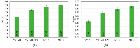 Figure 5 shows mean values for all machine learning methods evaluated in this research, with respect to the different classification scenarios. In the single-date S1 image analysis, an improvement of 20% and 0.24, in terms of the OA and Kappa values was achieved with speckle filtering. Further increase in the OA of 8.59% and 13.66% occurred with the use of three and five S1 imagery for LC classification, respectively.