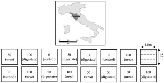 This research was conducted at the experimental field of the Istituto Tecnico Agrario in Florence, Italy, (WGS84: 43°47′06″ N; 11°13′06″ E; 40 m.a.s.l.) between May and August 2019 (Figure 1). The study was organized in a completely randomized design with one factor and five N fertilization levels, each with three replicates. The N fertilization levels were as follows: urea CO(NH2)2 at a rate of 100 and 50 kg N ha−1, digestate at a rate of 100 and 50 kg N ha−1, and a control with 0 kg N ha−1 (hereafter: 100-urea, 50-urea, 100-digestate, 50-digestate, and 0-control). Fertilizers (urea and digestate) were applied 28 and 49 days after sowing (DAS) and incorporated into the soil through mechanical tillage (harrowing at 20 cm depth). Experimental plots of 2.10 × 1.80 m (3.78 m2) were subdivided into four rows, spaced 70 cm apart and with 10 cm between plants. Quinoa was sown on 8 May 2019, at a sowing rate of about 140–150 plants m−2 and harvested on 27 August 2019 (110 DAS). The selected genotype was Titicaca, a hybrid developed at the University of Copenhagen, Denmark.