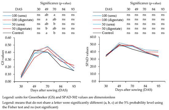 Time series of GreenSeeker-GS (left) and SPAD-502 readings (right) for different N fertilization treatments (100/50 kg N ha−1 urea, 100/50 kg N ha−1 digestate, and 0 kg N ha−1 -control).