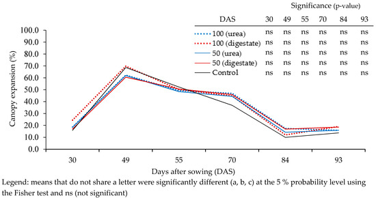 Canopy cover expansion (%) for different N fertilization treatments (100/50 kg N ha−1 urea, 100/50 kg N ha−1 digestate, and 0 kg N ha−1 -control).