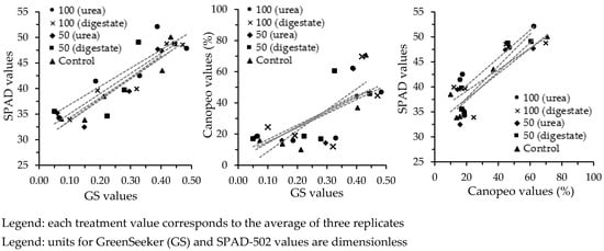 Relationship between different POSs (SPAD-502, GreenSeeker, and Canopeo App.) and N fertilization treatments (100/50 kg N ha−1 urea, 100/50 kg N ha−1 digestate, and 0 kg N ha−1 -control).