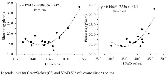 Polynomial regression between SPAD-502 (at 70 DAS) and GreenSeeker-GS (at 84 DAS) observations with biomass at harvesting (at 110 DAS).