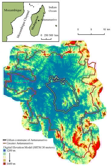 Figure 1) includes the entire area (770 km²) of Greater Antananarivo, the capital and at the same time the largest city in Madagascar. Antananarivo is located in the center of the island at 1280 m above sea level. The topography is characterized by a large floodplain in the western part of the city, bordered by a succession of hills in the eastern part. Greater Antananarivo is made up of 38 municipalities, including the Urban Commune of Antananarivo (UCA), in the center, which houses the historic heart of the city. In terms of demography, Great Antananarivo has a high population density compared with other Malagasy cities, with 780 inhabitants per km² on average, and 18,000 inhabitants per km² in the UCA (which is comparable to the most densely populated cities in the world). In 2015, the estimated total population was three million inhabitants [