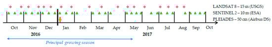 Figure 2 shows the chronogram of the satellite images acquired between October 2016 and September 2017. Different types of satellite data were used:
