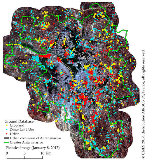 18]. Waypoints were collected throughout the study area to be representative of existing types of crops and urban structures. GPS points were also recorded for uncultivated and unbuilt classes such as natural spaces or water bodies. Each waypoint was then converted into a polygon by digitizing the boundaries of the corresponding land cover on a VHSR Pleiades image (0.5 m × 0.5 m pixel size). A total of 981 additional polygons were digitized by photointerpretation of the Pleiades image for easily recognizable classes (housing, brick extraction, rice, watercress, and savannah). The final ground database was thus composed of 3068 polygons including 1373 cropped, 813 urban, and 882 other land uses.