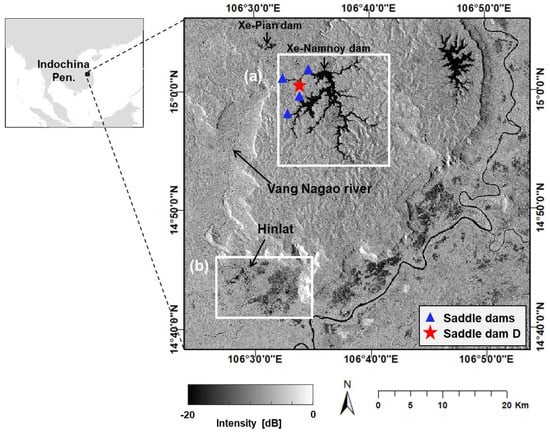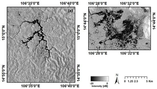 Intensity image acquired on 25 July 2018, after the dam collapse at (a) Xe-Namnoy reservoir, and (b) Hinlat area.