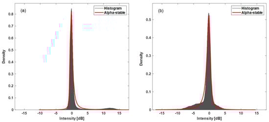 Additionally, to correct for geometric distortions in SAR images, that is, foreshortening, layover, and shadow effects, each reference image was applied according to the pass when calculating the difference image. The ascending image acquired on 13 July 2018 and the descending image on 17 July 2018 were used as reference images for each pass direction. After calculating the difference image () for each of the two study areas based on the reference images, an -stable distribution was fitted to the intensity distribution histogram of each difference image. Next, the value at the point where the histogram and fitting curve met was set as the threshold value (Figure 5). The -stable distribution was used for setting the threshold because this distribution is known to be suitable for high-skewness and heavy tailed data [40,41].