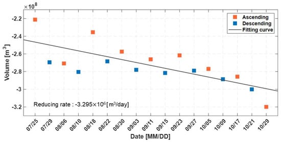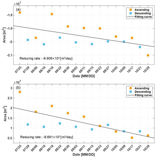 To quantitatively calculate the amount of water released from the Xe-Namnoy reservoir and the resulting flooding in the Hinlat area, the difference between the image taken after the dam collapse and the reference image (Table 1) was computed for each pass direction, and then the flood extent was calculated. The results confirmed that the surface area of water in the Xe-Namnoy reservoir continuously decreased (around −8.909 104 m2/day), and the area damaged by flooding in the Hinlat area gradually decreased (around −8.691 105 m2/day) (Figure 7). The slope of the fitting curve line was assumed to be the rate of flood extent reduction. The rate of flood extent reduction in the Hinlat area was about 10 times faster than the rate of water level decline in the Xe-Namnoy reservoir. Therefore, it is thought that the rate of flood extent reduction in the Hinlat area is faster than the rate at which water is drained from the deep reservoir.
