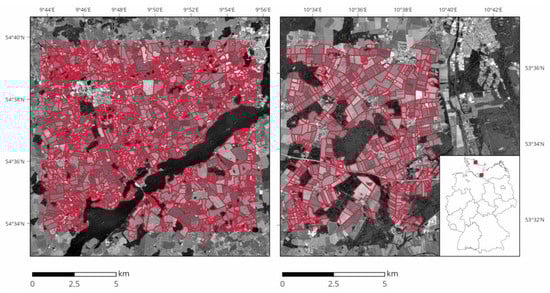 We obtained data from two study areas in the state of Schleswig-Holstein, Germany (see Figure 1). Both were predominantly used for agricultural purposes. Field sizes were rather heterogeneous in both regions, ranging from below 1 ha up to about 75 ha. Fields, especially in study area 1, were often irregular in shape. The landscape structure is a mixture of agricultural areas with small forests, grasslands, and smaller urban agglomerations.