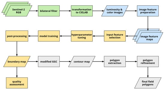 Flowchart of the methodology. Different stages highlighted in colors: pre-processing in green, image feature preparation in blue, boundary detection model development in yellow, and contour detection and field polygon extraction in grey.