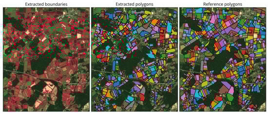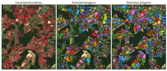 As seen in Figure 7 and Figure 8, distribution and general shapes of extracted polygons often closely resemble those of the reference polygons. However, shapes tend to be a bit smoother and edges more rounded (e.g., Figure 7 and Figure 8 bottom center). Smaller fields, in particular, were occasionally missed or merged with larger fields (e.g., Figure 7 and Figure 8 top center). This can be explained in part by issues in the prior boundary detection step, e.g., inconsistent boundaries or some falsely detected boundaries within the fields. Other fields were also missed by the process, again partly due to the boundary detection step (e.g., Figure 7 and Figure 8 bottom left).