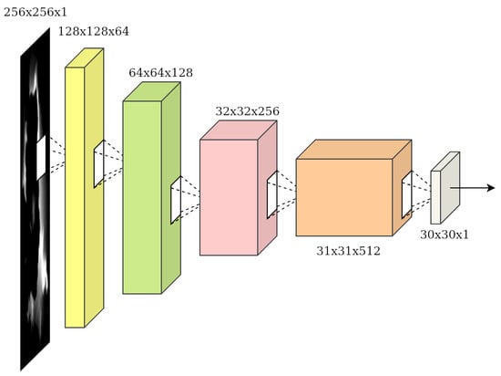The discriminator’s objective is to utilize convolutional layers to reduce the dimensions of the input images, ending up with a binary output classifying the input images as real or fake (synthesised by the generator). In our case, a PatchGAN is used [55]. The main difference is that the traditional CNN architecture would come to a decision based on the whole input image, whereas the PatchGAN maps the image, in our case, to a square array of outputs. Each output “pixel” signifies whether the corresponding patch is real or fake. The final decision is derived by averaging over all the individual patches. The PatchGAN architecture can be seen in Figure 1.