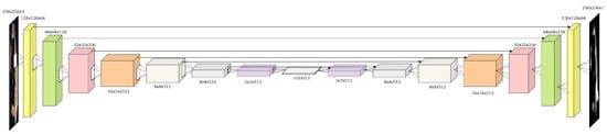 The generator, on the other hand, is a U-net [45], an encoder-decoder architecture. That is to say, the encoder downsamples the conditioning input (e.g., satellite) image down to a bottleneck layer (also denoted as code, hence the name encoder) using a series of convolutional layers. Afterwards, the decoder, through a series of deconvolutions, roughly the inverse operator of the convolution, the images are upsampled, decoding the bottleneck code to the size of the output image. Every convolutional layer in the encoder is connected with a skip connection to its respective deconvolutional layer in the decoder, by concatenating the encoder’s output to the decoder’s input channel-wise, helping the model to converge during training since it skips some layers by feeding the output of one layer as the input to next layers [56]. This facilitates training, provided the low-level structure, which can be thought of as the pixel-level structure, is the same between input and output, as is the case in our area of interest. Certain generators in GAN models, specifically the decoder, receive random noise as additional input, resulting in one-to-many relationships [57]. In our case, such a practice is not only unnecessary but actually detrimental, as we would like to construct a deterministic function, relying solely on the input condition to generate output images. The architecture of the U-net can be seen in Figure 2.