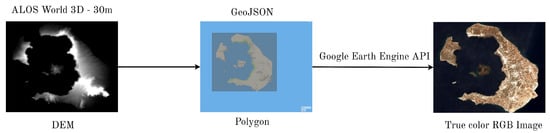 Flow chart of the satellite-imagery dataset collection process using the Google Earth Engine API. The outermost points of the georeferenced DEM are selected as the boundary for the GeoJSON Polygon, which when fed into the API returns the corresponding RGB satellite image.