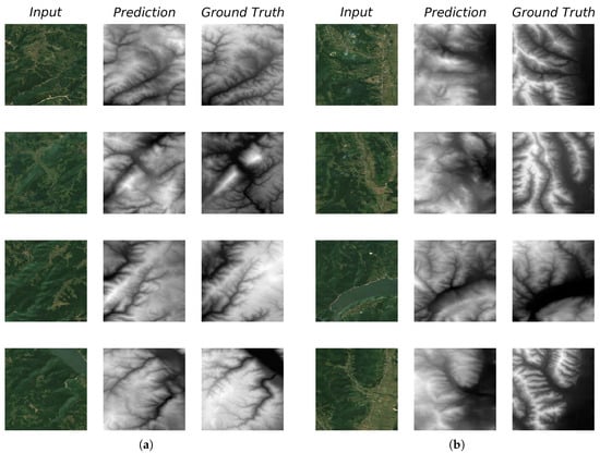The generator’s results on previously unseen testing data. (a) In most cases it proves to have learned to capture the underlying relation between satellite imagery and DEMs, producing sharp results. (b) Even when reconstructions are poor, the model does not collapse to the easy solution of producing blurry results to approximate the result with minimum error, but manages to generate plausible representations in terms of DEM structure. Note that we used our data augmentation technique (Section 2.8).